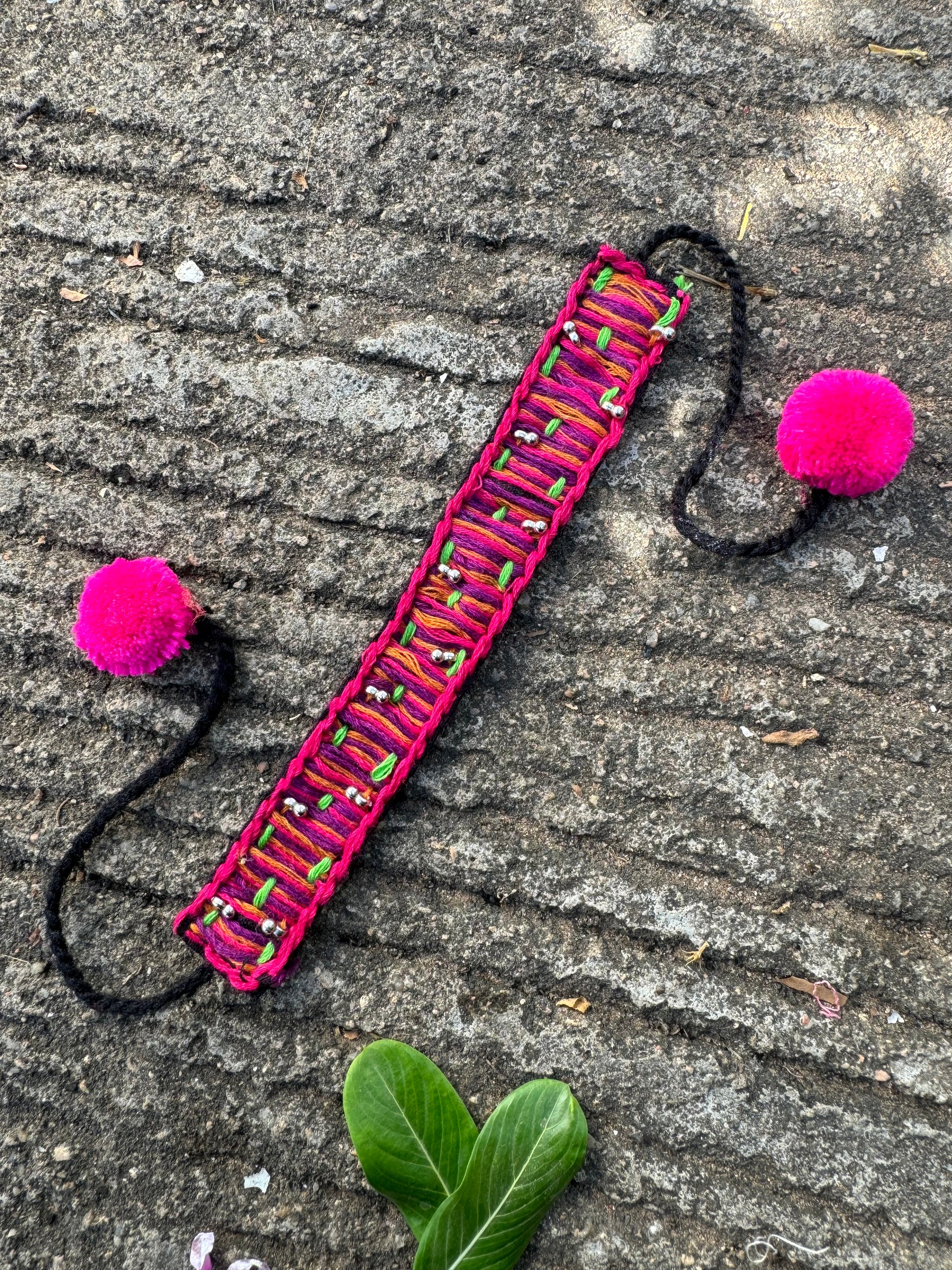 This Hand embroidered accessory finished with vintage ghungroos and pom poms can be wear as anklet or Bajubandh.